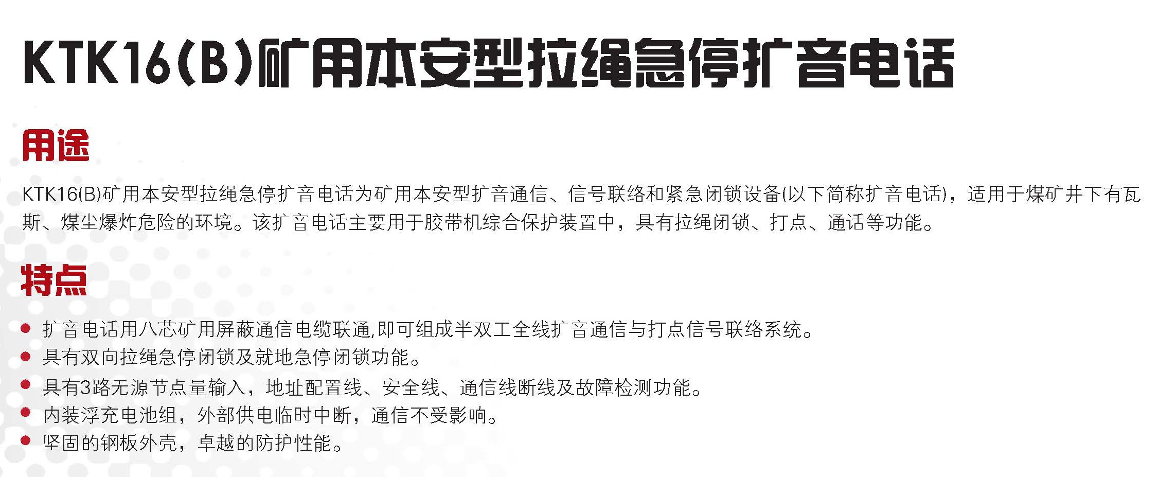 • 上一篇:KTK16(A)矿用本安型拉绳急停扩音电话