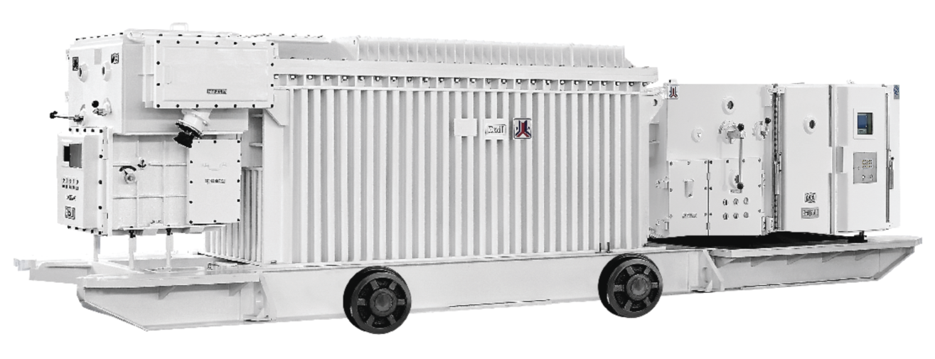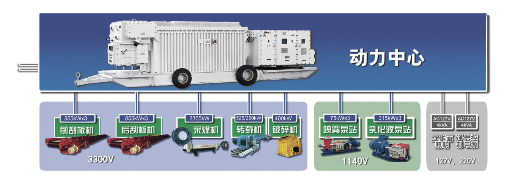 矿用隔爆兼本质安全型动力中心,适用于煤矿井下甲烷爆炸性环境中,为移动式成套设备,由高压真空开关、多绕组变压器和多电压多回路组合开关组成。一次电压10kV(或6kV、3.3KV),二次电压3.3 kV、1.14kV、0.66kV、0.38kV,向综采工作面各采、运、支设备供、变电,并提供完善可靠的控制与保护。高压侧高压真空开关、低压侧多回路组合开关,通过法兰与变压器连为一体。本设备都安装在平板车上,用户可以根据需要在动力中心的任意一端,方便地移动设备。