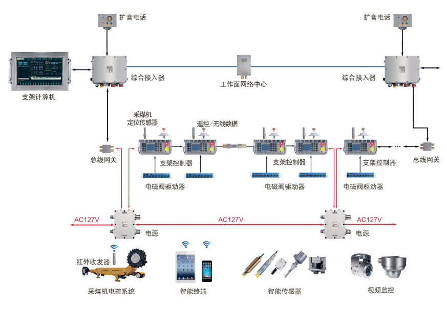 液压支架控制器协同自主开发的采煤机电控系统,结合采煤机精确定位技术和稳定迅捷的数据共享技术,能够安全、高效地实现全工作面支架自动跟机作业,支架自动跟机效率提升20%。同时,控制器使用具有自主知识产权的“有线+无线”双总线冗余设计,使得系统运行更加稳定、可靠。电液系统使用支架采高、推移行程、姿态、油缸压力等传感器,实现了工作面支架群的有序动作,通过协同控制工艺,控制器操作液压支架自主完成自动收打护帮板、自动推溜、自动跟机拉架等动作,从而实现液压支架自动控制、故障诊断的智能化协同作业,进一步提升了智能化建设。