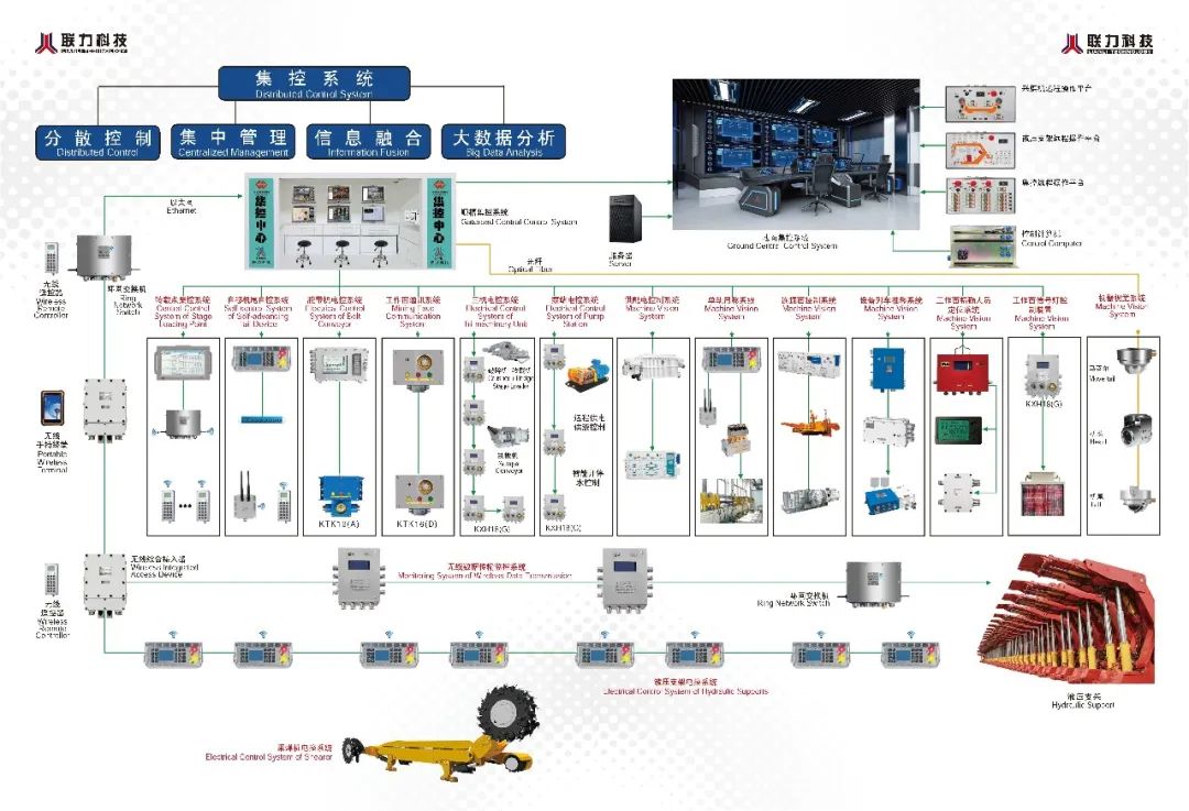 柳塔煤矿目前配套联力科技的综采智能化系统主要有:支架电液控系统、采煤机电控系统、工作面视频系统、人员接近防护系统、工作面集控中心等。成套智能系统的应用实现了采煤机和支架数据共享,直接对话。经过改造后的采煤机采用十二工步割煤工艺,简化了控制逻辑,使割煤工艺无缝衔接,实现了全工作面记忆割煤。液压支架控制器协同采煤机电控系统,结合采煤机精确定位技术和稳定迅捷的数据共享技术,实现了距离煤机观察窗0.5架高精度的超前自动跟机拉架,解决了漏矸不能自动跟机拉架的难题,保证了工作面支架自动跟机的安全、高效及30%的效率提升。此外,人员接近防护闭锁煤机、支架系统采用视频智能识别及UWB定位技术,定位精度达到1个支架宽度,保障了工作面内人员的安全。同时,工作面视频系统全覆盖,实现了大块煤识别、护帮板识别、视频自动跟机等功能的远程可视化,为地面远程操作打下了基础。(部分内容引自公众号神东煤炭之声之《神东首个综采成套智能化系统在柳塔煤矿成功应用》)