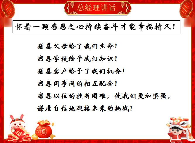 讲话最后,刘总说到:"我们要怀着一颗感恩之心,持续奋斗,这样才能幸福持久!我们要感恩父母给了我们生命!要感恩学校给予我们知识!要感恩客户给予了我们机会!要感恩同事间的相互配合!感恩以往的挫折困难,使我们更加坚强,谦虚自信地迎接未来的挑战!"刘总的讲话深深留存于我们每一个联力人的内心,我们也将带着这颗感恩之心努力做好自己,拓路前行,再战兔年,2023再创辉煌!