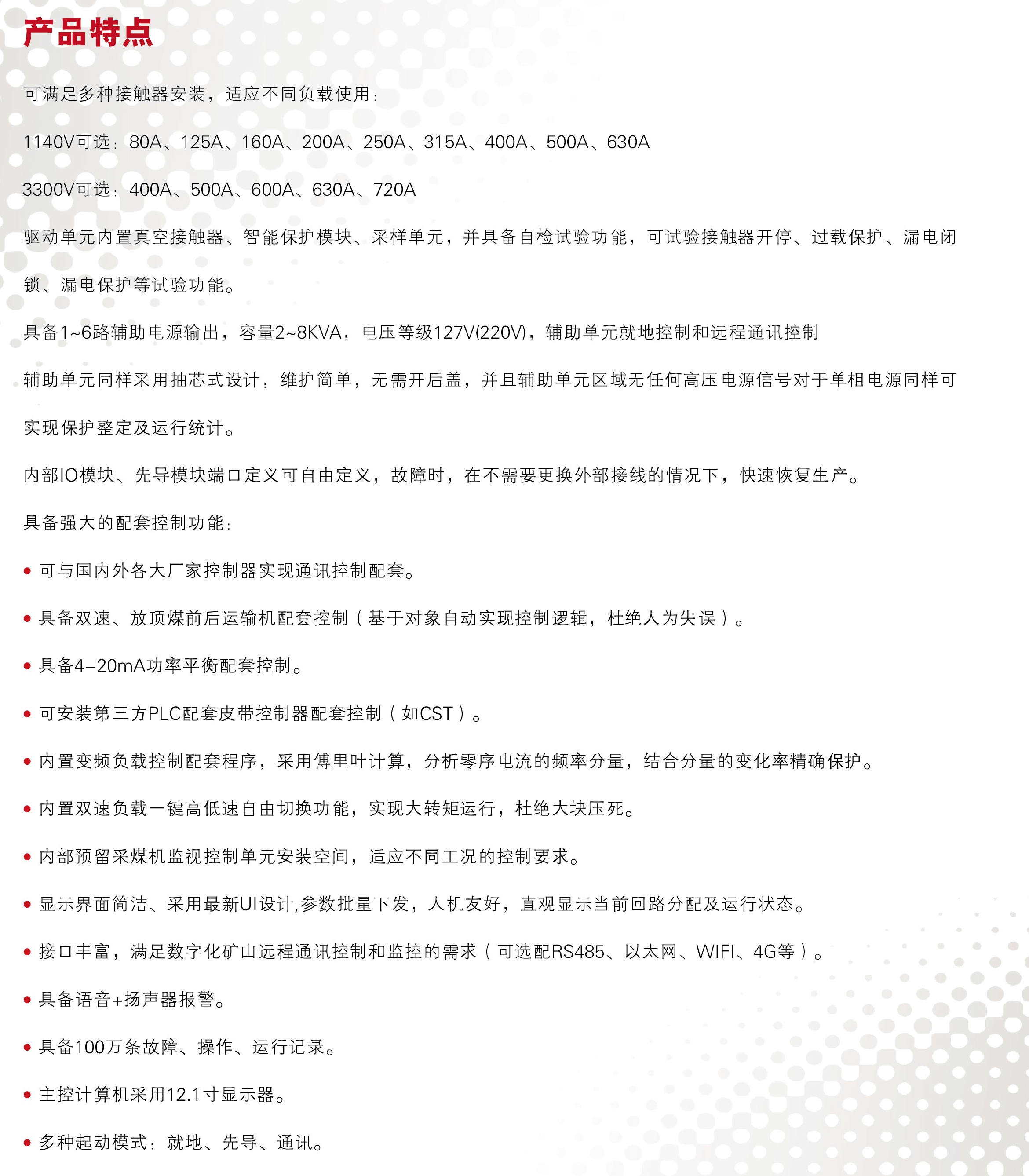 综采工作面集散控制系统 顺槽集控系统 转载点集控系统 采煤机电控系统 三机电控系统 液压泵站控制系统 工作面通信系统 煤矿用带式输送机保护装置 无线数据传输监控系统 自移机尾(马蒂尔)自控系统 支架电液控制系统 工作面机器视觉系统 连掘面集控系统 精确人员定位系统 单轨吊推移系统 煤矿用带式输送机保护装置 工作面设备列车成套设备