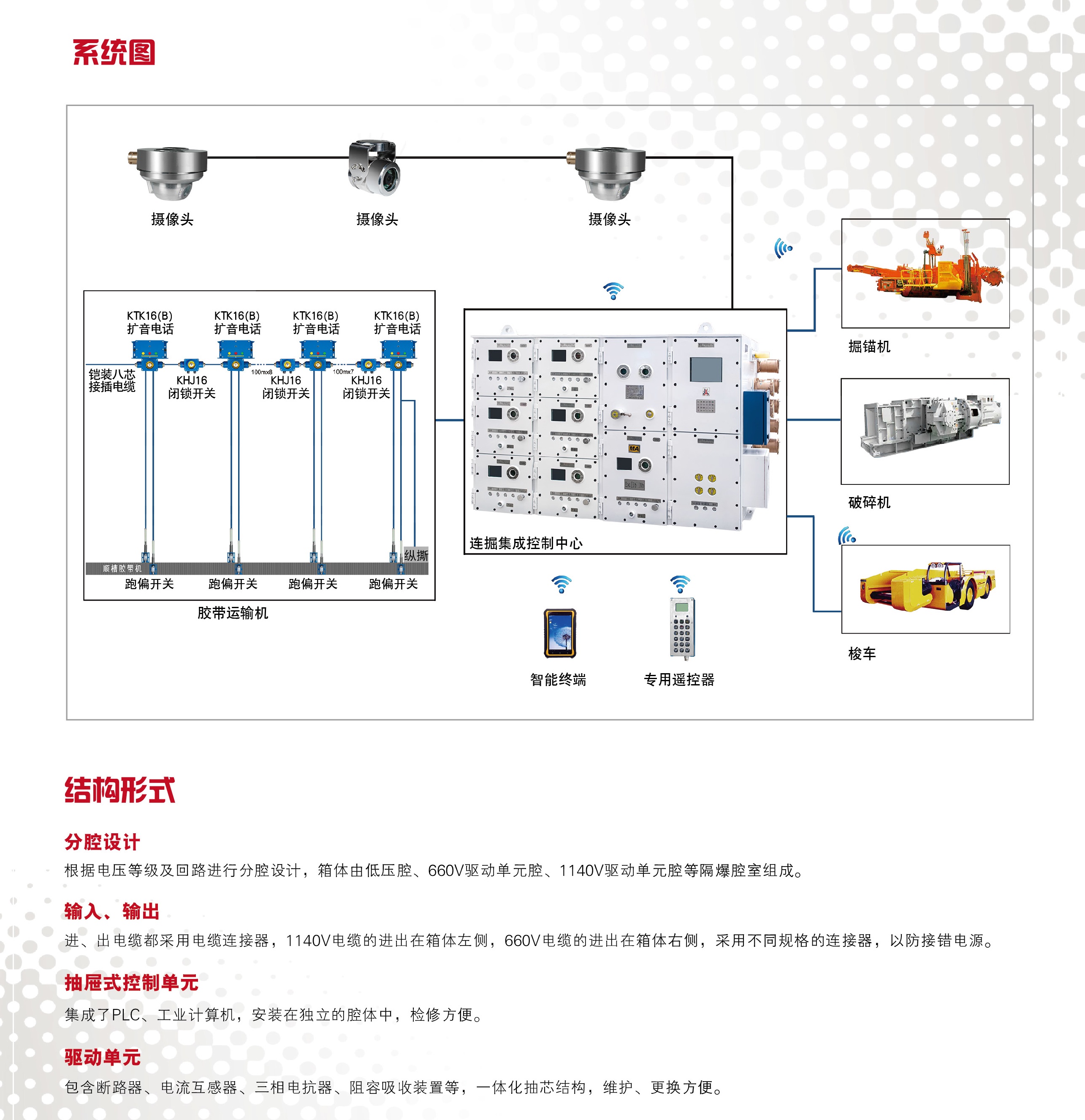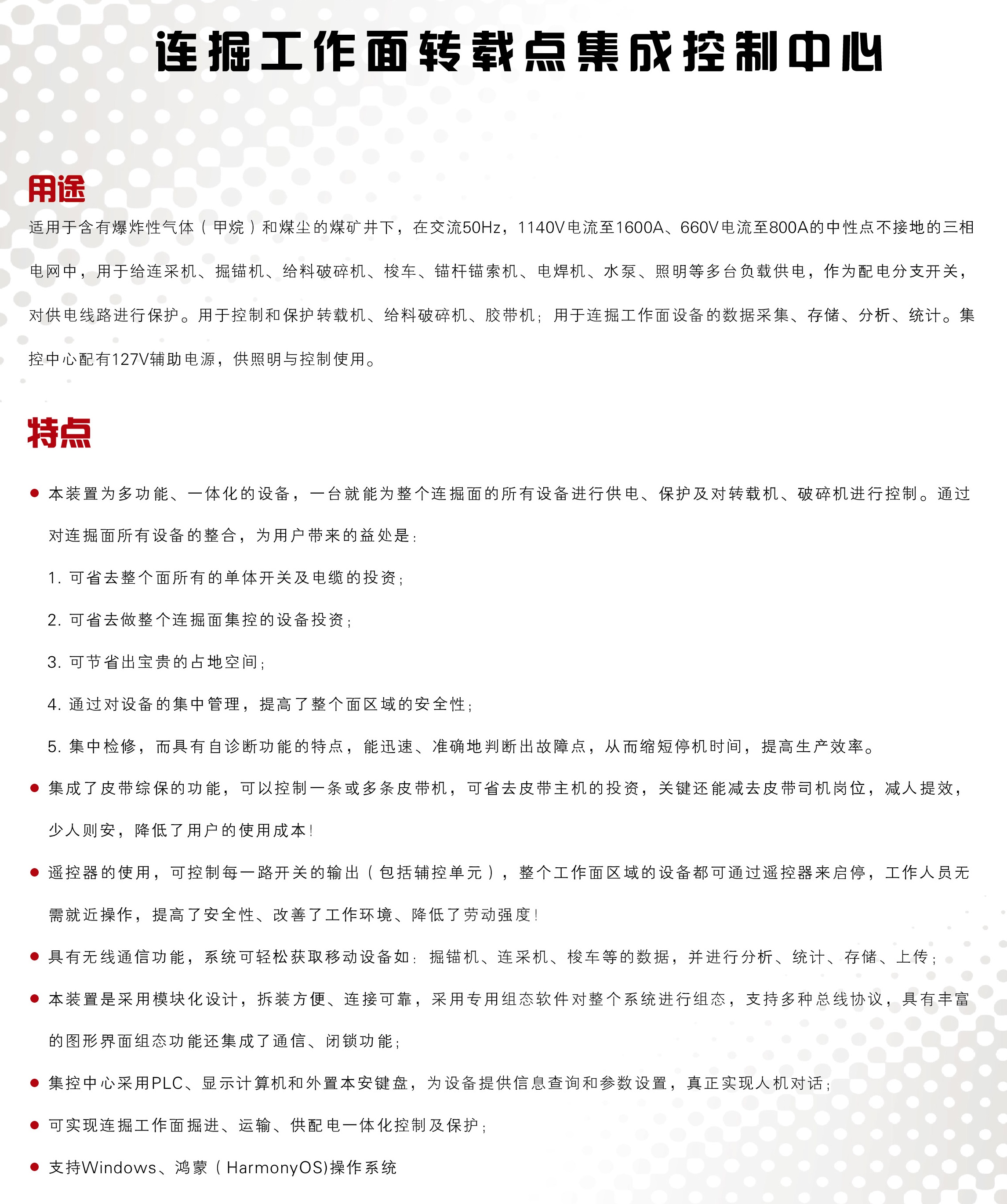 综采工作面集散控制系统 顺槽集控系统 转载点集控系统 采煤机电控系统 三机电控系统 液压泵站控制系统 工作面通信系统 煤矿用带式输送机保护装置 无线数据传输监控系统 自移机尾(马蒂尔)自控系统 支架电液控制系统 工作面机器视觉系统 连掘面集控系统 精确人员定位系统 单轨吊推移系统 煤矿用带式输送机保护装置 工作面设备列车成套设备