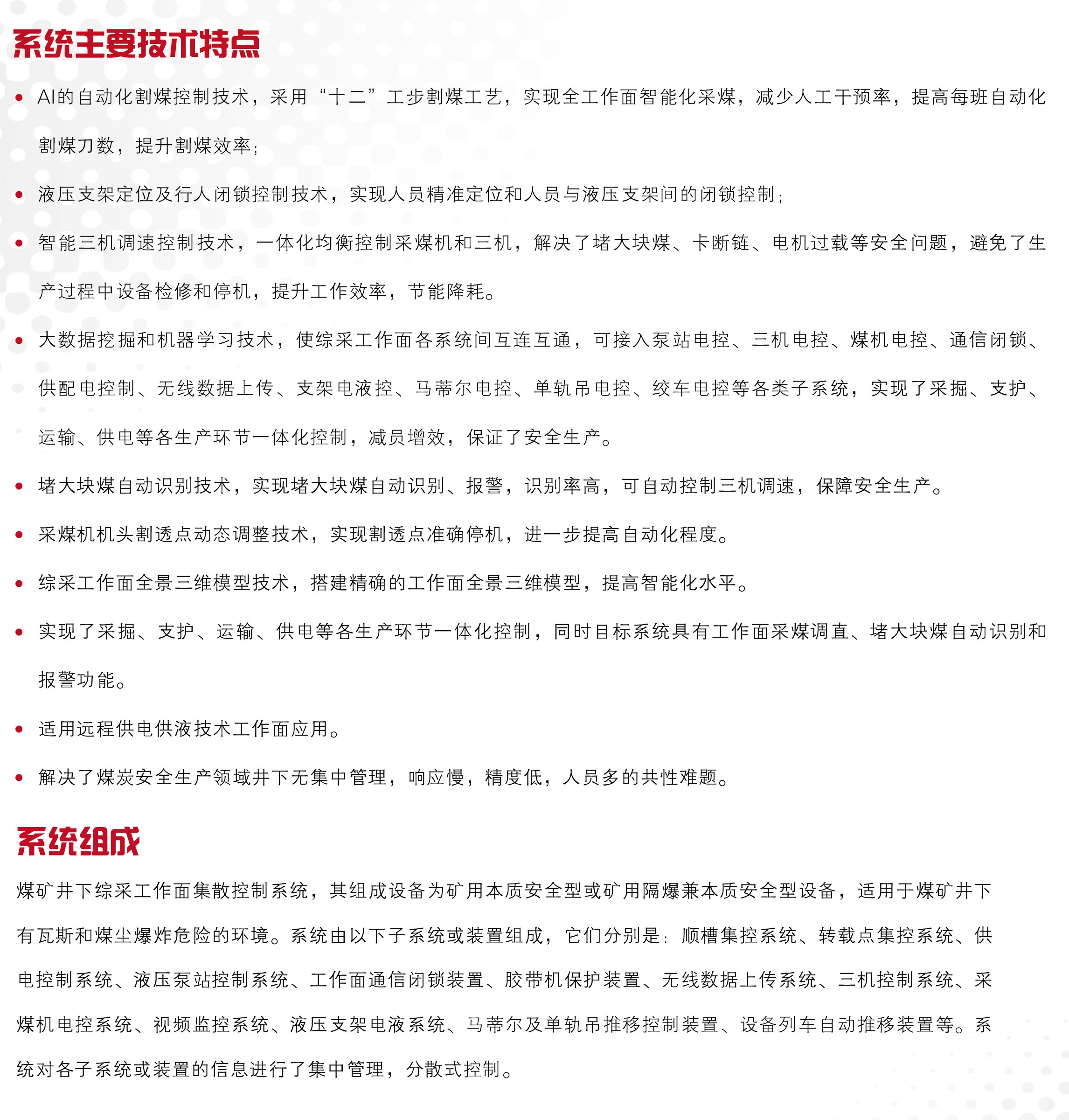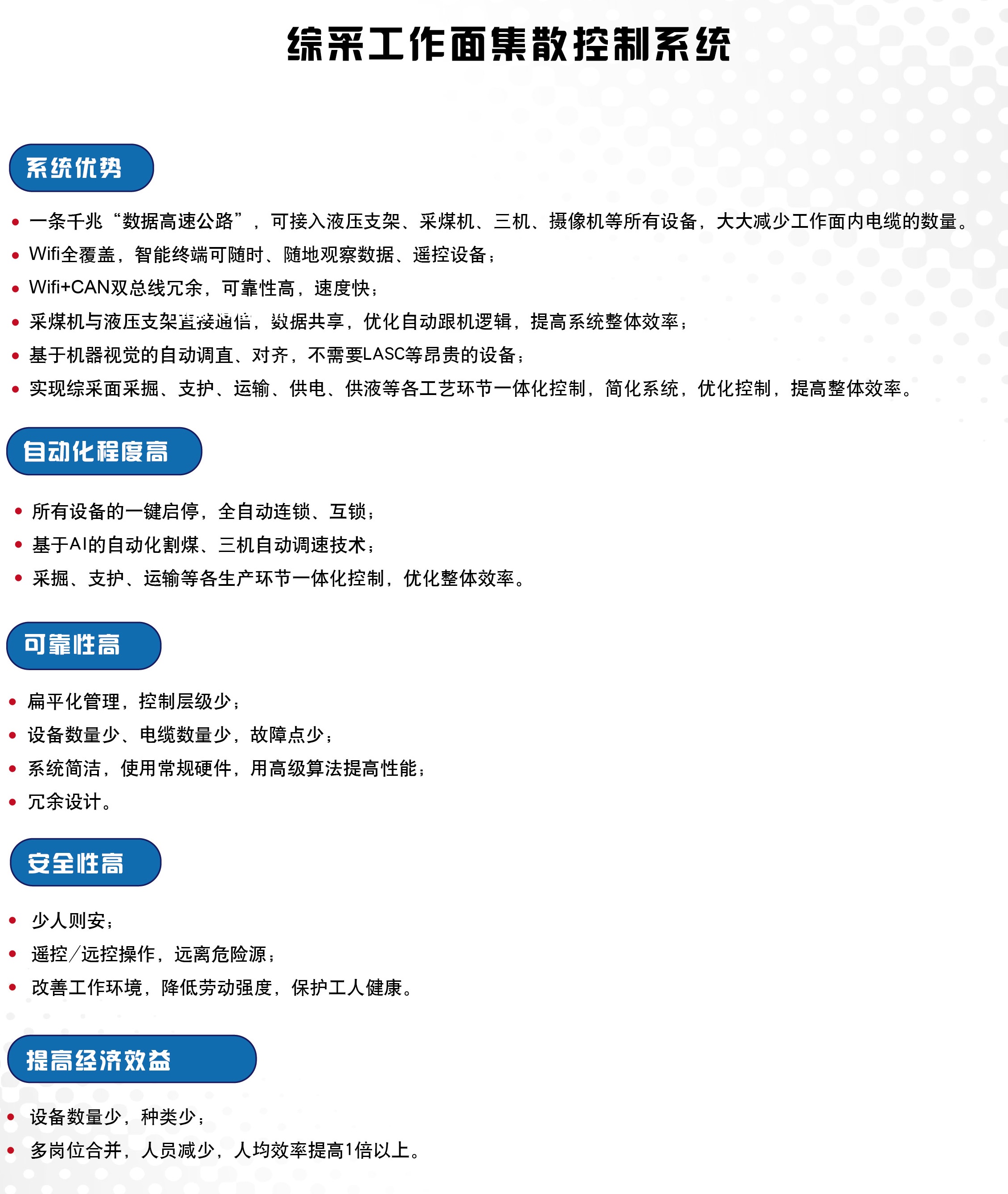 综采工作面集散控制系统 顺槽集控系统 转载点集控系统 采煤机电控系统 三机电控系统 液压泵站控制系统 工作面通信系统 煤矿用带式输送机保护装置 无线数据传输监控系统 自移机尾(马蒂尔)自控系统 支架电液控制系统 工作面机器视觉系统 连掘面集控系统 精确人员定位系统 单轨吊推移系统 煤矿用带式输送机保护装置 工作面设备列车成套设备