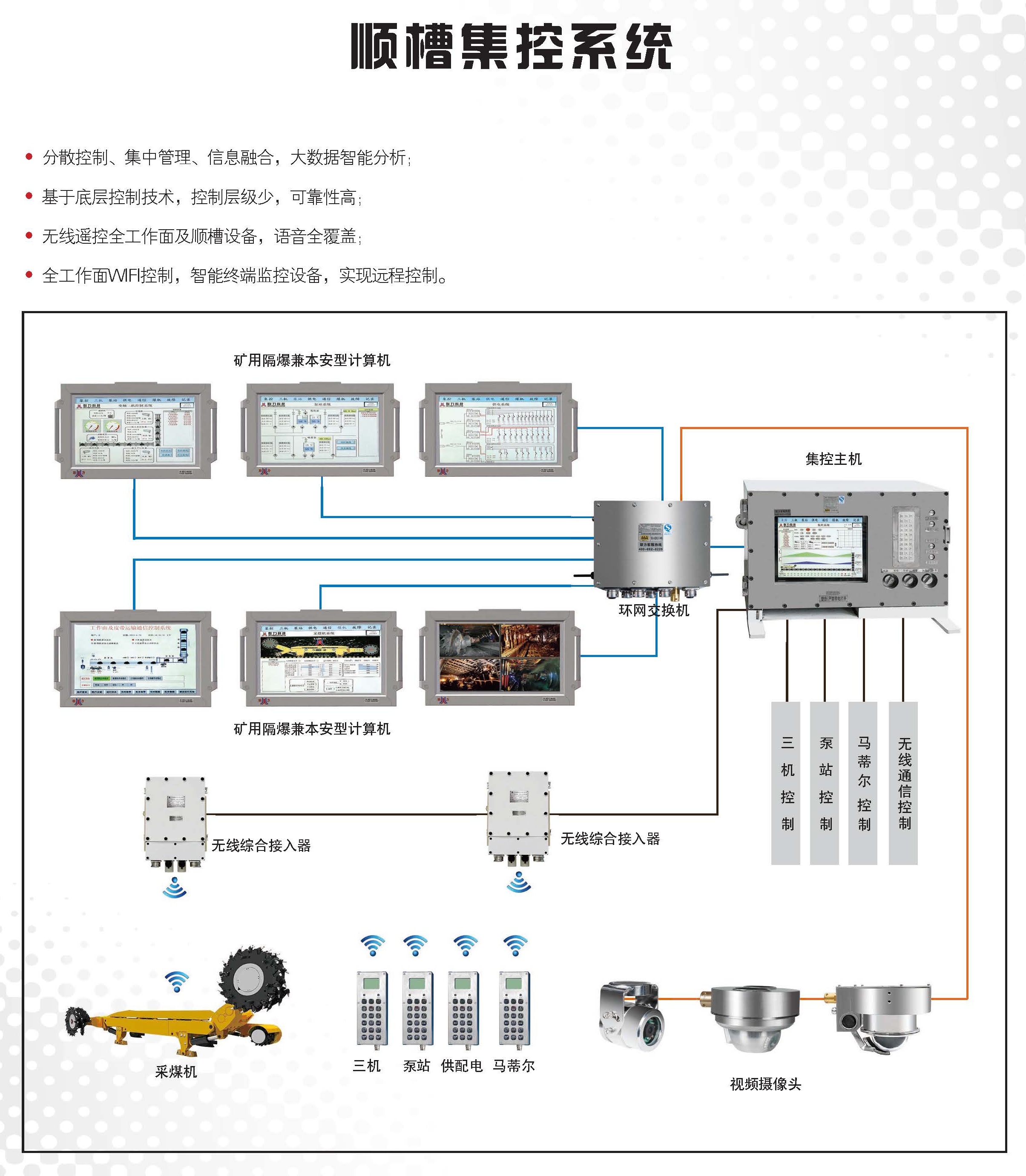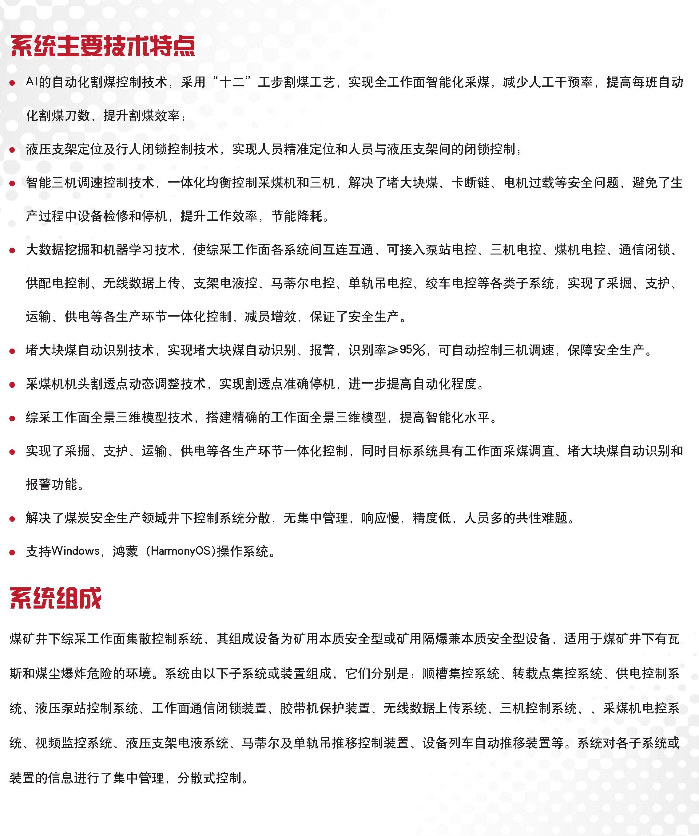 综采工作面集散控制系统 顺槽集控系统 转载点集控系统 采煤机电控系统 三机电控系统 液压泵站控制系统 工作面通信系统 煤矿用带式输送机保护装置 无线数据传输监控系统 自移机尾(马蒂尔)自控系统 支架电液控制系统 工作面机器视觉系统 连掘面集控系统 精确人员定位系统 单轨吊推移系统 煤矿用带式输送机保护装置 工作面设备列车成套设备