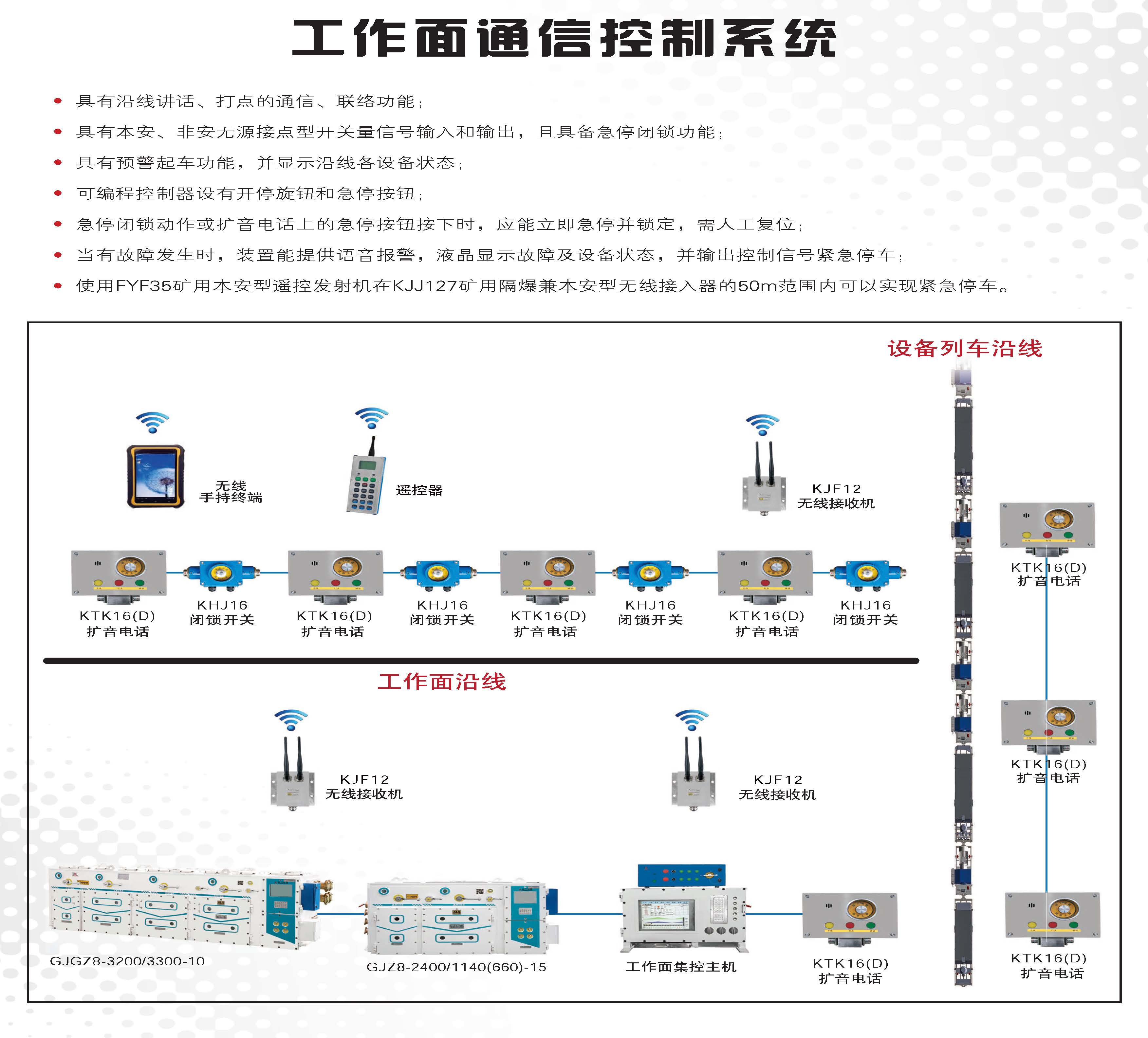 综采工作面集散控制系统 顺槽集控系统 转载点集控系统 采煤机电控系统 三机电控系统 液压泵站控制系统 工作面通信系统 煤矿用带式输送机保护装置 无线数据传输监控系统 自移机尾(马蒂尔)自控系统 支架电液控制系统 工作面机器视觉系统 连掘面集控系统 精确人员定位系统 单轨吊推移系统 煤矿用带式输送机保护装置 工作面设备列车成套设备