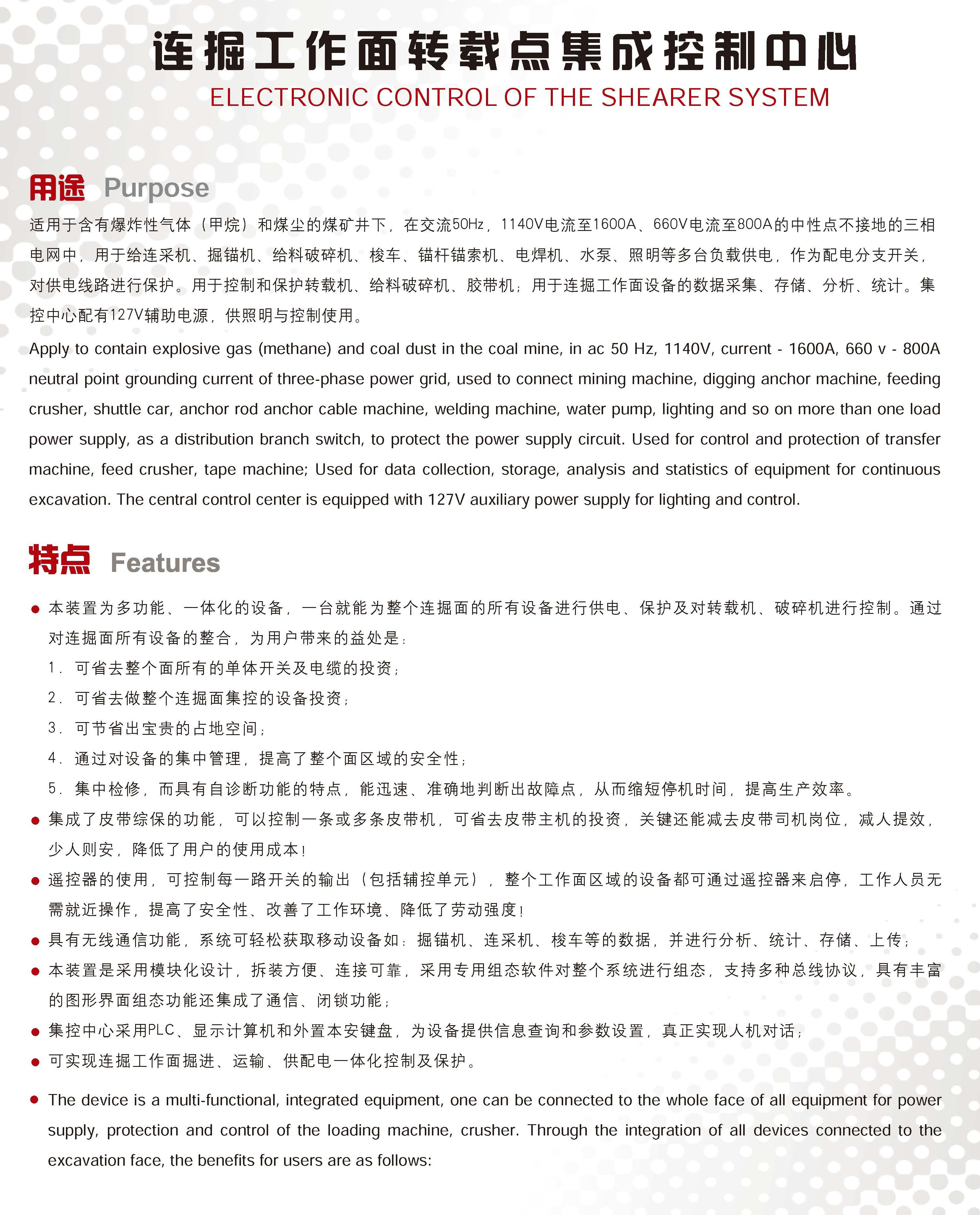 综采工作面集散控制系统 顺槽集控系统 转载点集控系统 采煤机电控系统 三机电控系统 液压泵站控制系统 工作面通信系统 煤矿用带式输送机保护装置 无线数据传输监控系统 自移机尾(马蒂尔)自控系统 支架电液控制系统 工作面机器视觉系统 连掘面集控系统 精确人员定位系统 单轨吊推移系统 煤矿用带式输送机保护装置 工作面设备列车成套设备