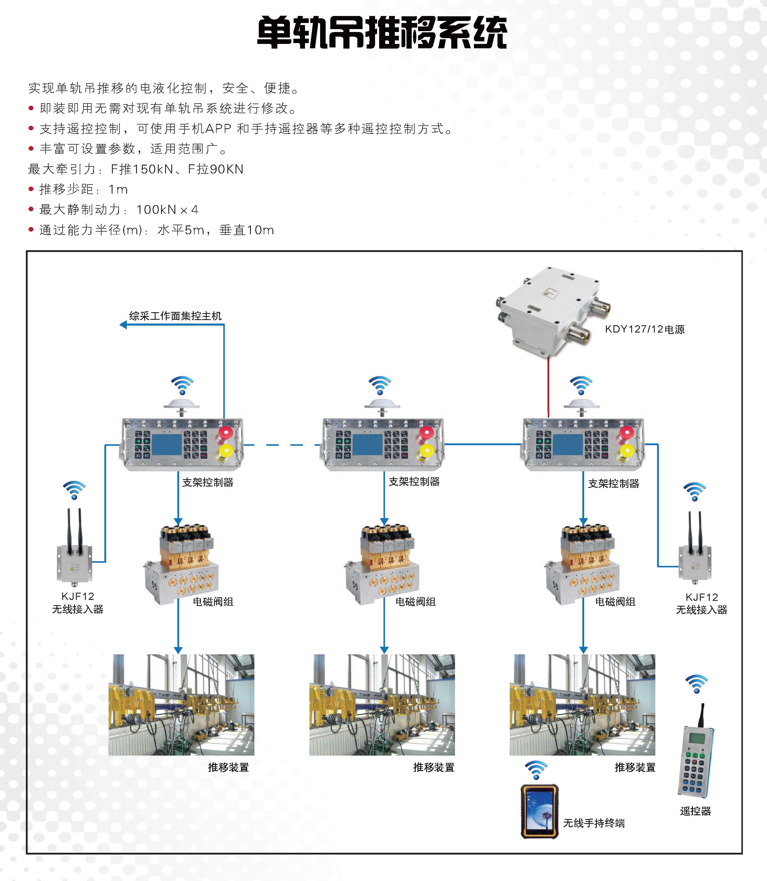 综采工作面集散控制系统 顺槽集控系统 转载点集控系统 采煤机电控系统 三机电控系统 液压泵站控制系统 工作面通信系统 煤矿用带式输送机保护装置 无线数据传输监控系统 自移机尾(马蒂尔)自控系统 支架电液控制系统 工作面机器视觉系统 连掘面集控系统 精确人员定位系统 单轨吊推移系统 煤矿用带式输送机保护装置 工作面设备列车成套设备